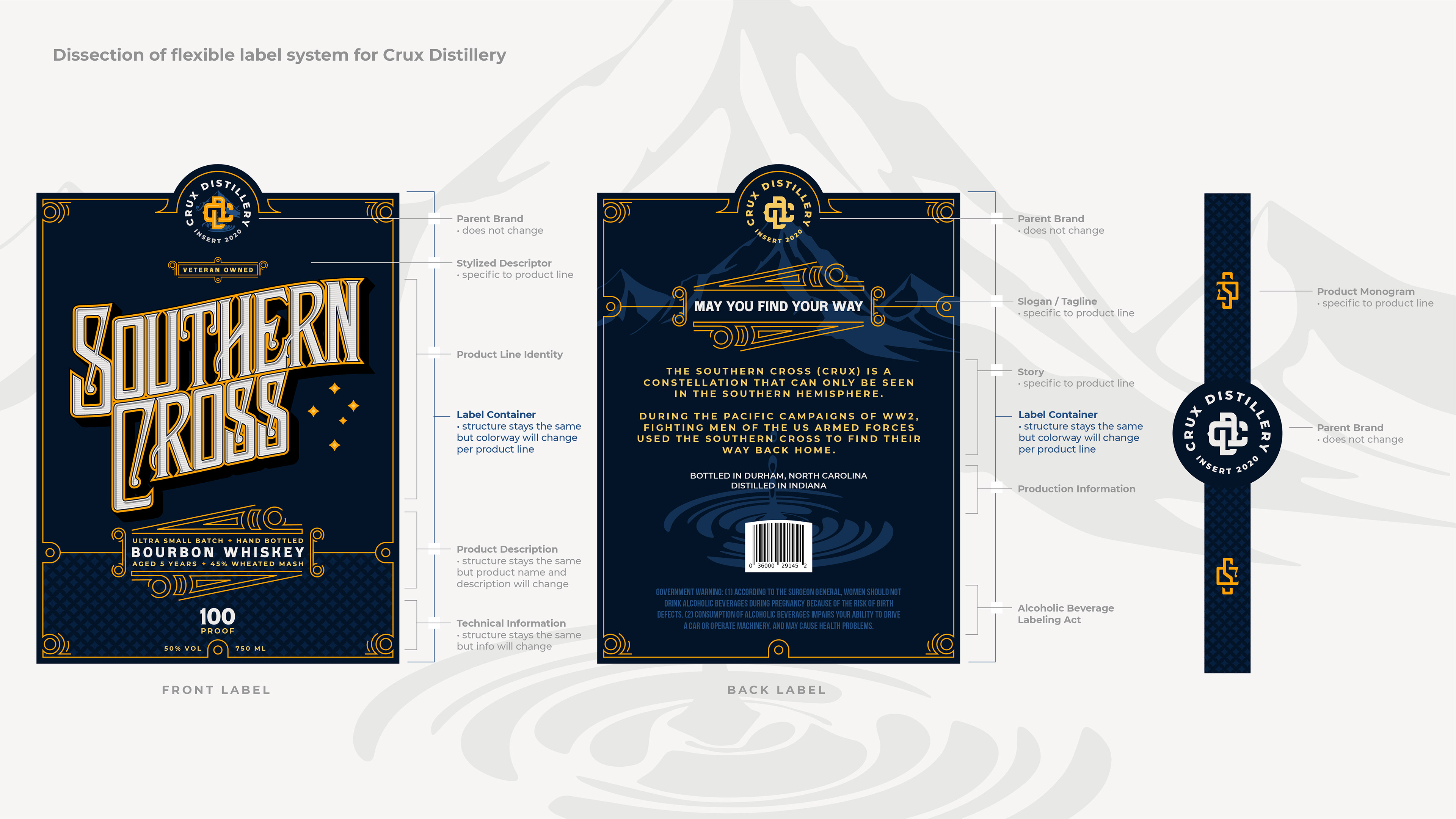 Crux Distillery came in for a label refresh on their flagship bourbon, Southern Cross. It became clear the larger opportunity was brand architecture. We applied the MNDH Brand Discovery Framework to define the master brand before refining the hero product.